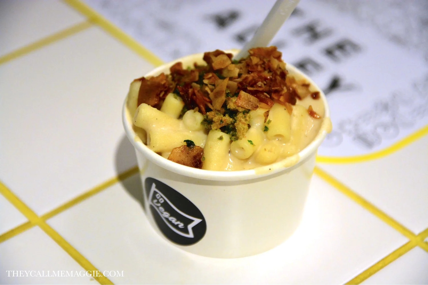 Mac 'N' Cheese - with sweet corn, creamy white bean and cashew sauce, topped with coconut bacon and breadcrumbs.